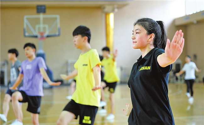 來自鄭州西亞斯學(xué)院和鄭州七中的18名運動員正在進(jìn)行民族健身操訓(xùn)練。