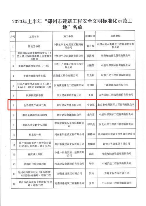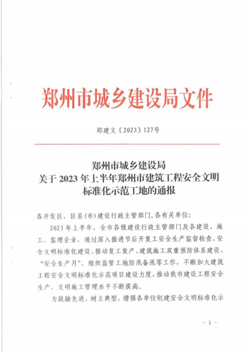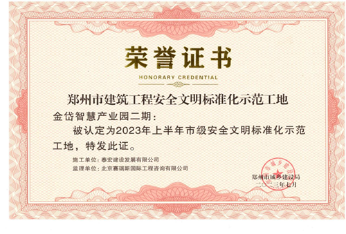 近日,經鄭州市城鄉(xiāng)建設局評選,河南鄭地科創(chuàng)產業(yè)發(fā)展有限公司投資建設的金岱智慧產業(yè)園二期項目榮獲“2023年上半年鄭州市建筑工程安全文明標準化示范工地”榮譽稱號。