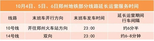 10月4日至6日,鄭州地鐵相關(guān)線路延長運(yùn)營服務(wù)時(shí)間,請您留意“鄭州地鐵”微信公眾號(hào)。