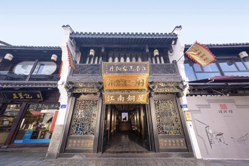 以朱炳仁團(tuán)隊打造的銅屋系列為例:入駐亳都·新象的“中原銅屋”是其全國第四家、華中第一家銅屋。建筑內(nèi)部以超高、超寬的銅板工藝打造出“銅盒子”視覺焦點(diǎn),磚木結(jié)構(gòu)搭配著銅與玻璃的碰撞,產(chǎn)生時空交錯的美感。“中原銅屋”整體風(fēng)格和中原民居相適配,當(dāng)訪客的指尖掠過帶有紋飾的銅器,恰似完成一場跨越三千年的文明對話——要知道,商城遺址曾出土過杜嶺方鼎等商代青銅文明的巔峰之作,這份地域文化根脈在此得到了呼應(yīng)。