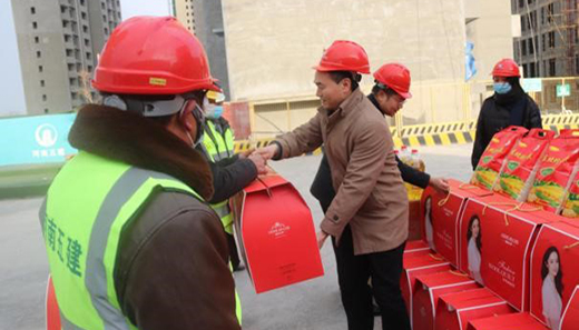 春節(jié)將至,為將工會(huì)組織的溫暖及時(shí)送到廣大工友手中, 2月7日下午,鄭州市總工會(huì)機(jī)關(guān)工會(huì)主任王銀倉、副主任張翔宇,鄭州地產(chǎn)集團(tuán)監(jiān)事會(huì)主席、工會(huì)主席李靜波、女工主任鄭琪在西流湖公司副總經(jīng)理、工會(huì)主席昌磊的陪同下,深入中原新區(qū)三十里鋪中安置區(qū)施工現(xiàn)場,開展春節(jié)送溫暖慰問活動(dòng)。